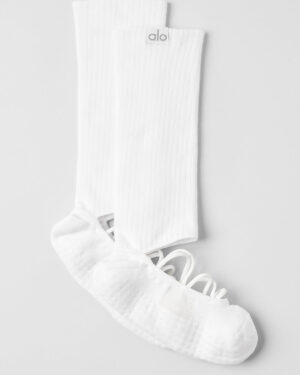A studio class essential, this crew-length barre sock features cushioned soles with no-slip silicone grips, elastic cross-strap details and ribbed ankle cuffs.
