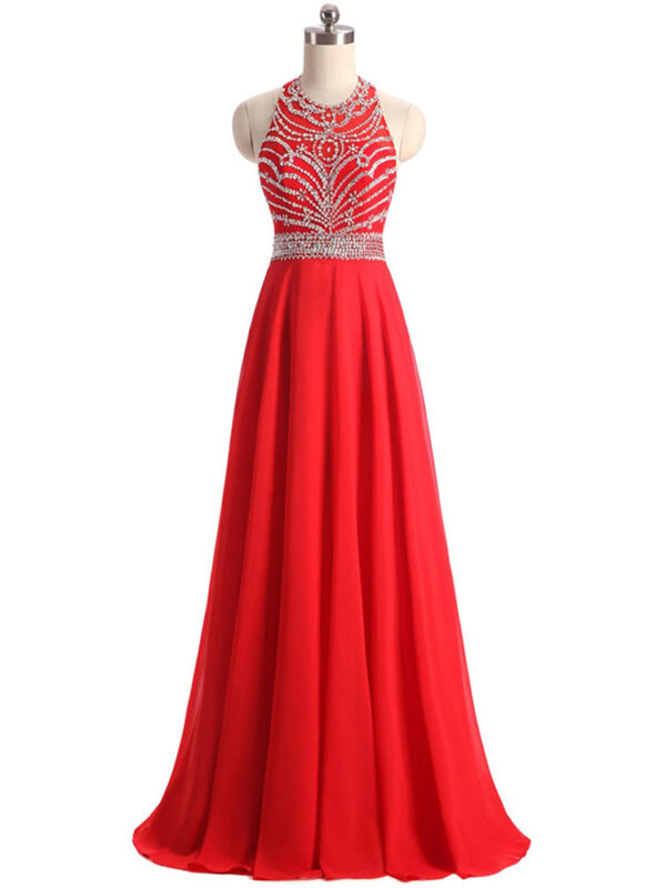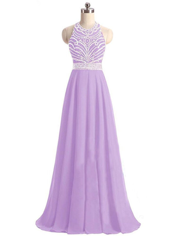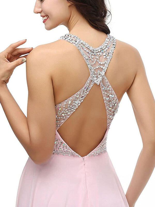 - Chiffon, Crew Neck, Sleeveless, Floor-Length, Beading, A-Line, Criss-Cross Zipper back design