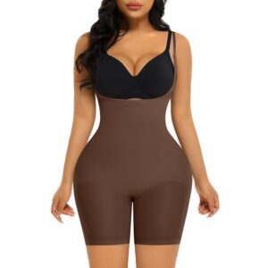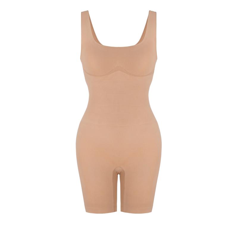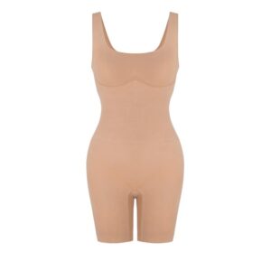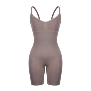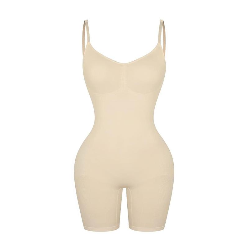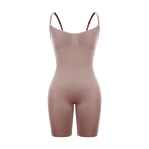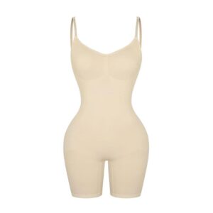 1.Fabric: 77% nylon + 23% elastane(77%nylon+23%Spandex)for stretching and comfort.2. Full-body bodysuit targets your belly, waist, and thighs, flattens your stomach and creates and sleek line from belly to thigh.3.Overlap gusset for easy when nature calls.Seamless knitting, no VPL under dresses, pants, cocktail, and more.Adjustable shoulder straps ensure a snug fit on you.4.The body shaping bodysuit is invisible beneath your daily clothes because of its seamless surface, light color and length.