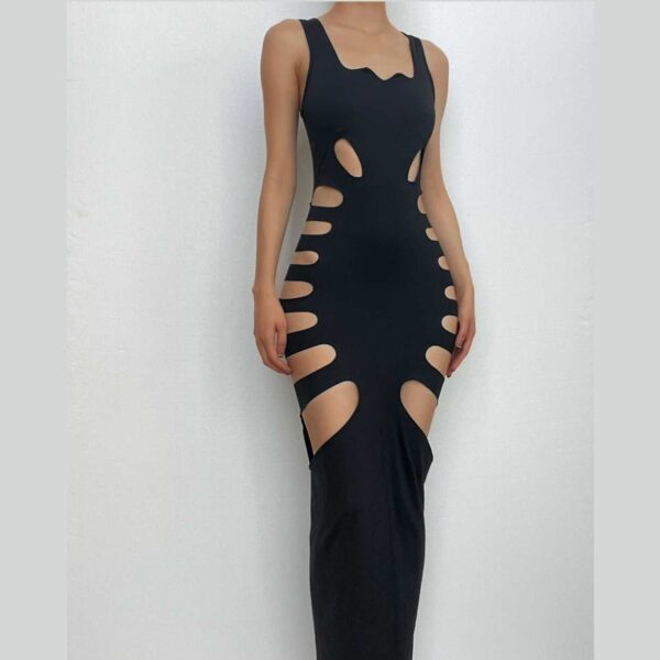 Hollow out solid slit sleeveless low cut cut out maxi dress