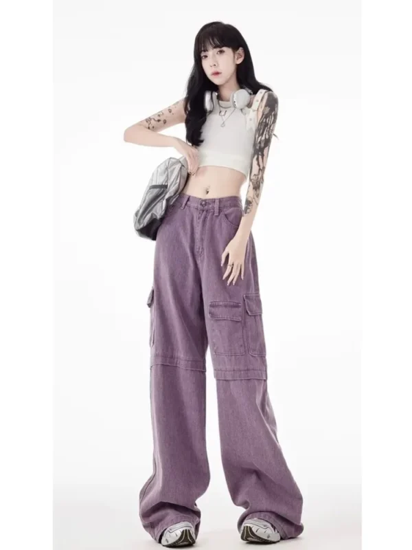 Vintage Purple Cargo Pants New Style Multi Pocket High Waist Casual Loose Drag Thin Wide Leg Pants Women’s Jeans
