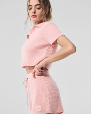 Cashmere Plush Waffle Polo Tee – Pink Quartz