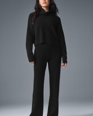 Cashmere Plush Waffle Turtleneck Pullover – Black