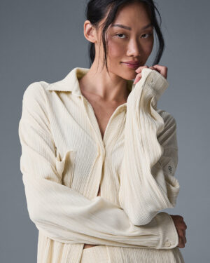 Our favorite style of the season? The Micro Plisse Shirt Dress. This duster-like style is super lightweight and chic, making it the perfect style to dress up or down. With only four buttons to keep the style closed, the piece is both flowy and airy. Pair it with the matching pants for an elevated look.