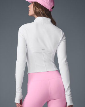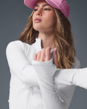 Waist-snatching corset body? Cute curved cut in front? Slim, smoothing fit? Check, check, and check. This jacket does more than flatter the figure, though: It has functional performance features, too, like a full front zipper, thumbholes and hip pockets. Plus, it??s made from Airbrush??an ALO signature fabric that feels like wearing a cottony-soft hug.