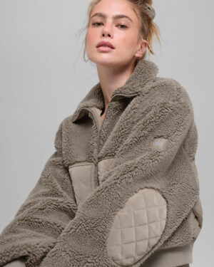 Done in sherpa with quilted patches at the pockets, elbows and back, this bomber jacket is, well, the bomb. We love the boxy, slightly cropped silhouette and the ribbing at the cuffs and hem?? it makes the fit even cozier. Throw it on over a matching set en route to your workout, zip it all the way up, show off the sherpa-lined collar.