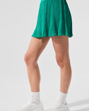 Pleat your heart out. The Micro Plisse Tennis Skirt refines the classic tennis skirt look with a fine texture of crinkled ridges. This double-knit pleated plisse fabric goes the distance with a logo at center front waistband, built-in shorts with pockets, and a flowy silhouette to pair with sports bra tanks, bodysuits, or a cropped polo.