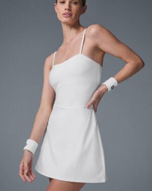 Fashion-forward and beyond functional, the Courtside is made of super soft, stretchy Alosoft with thin adjustable straps, a sweetheart neckline, a snug fit through the waist, and a mini-length A-line skirt. Bonus points for the hidden shelf bra and shorts. Just add a racquet and sneakers (for on the court) or sandals and a mini bag (for off the court).