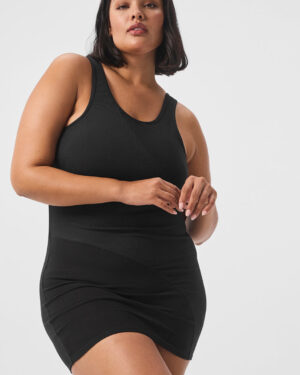 A cute solve for the get-ready-quick dilemma, this dress is made from a soft, smoothing fabric with a body-contouring ribbed panel through the torso. It has a wide scoop-back, a shelf bra for support, and a mini-length hem. And as for the figure-hugging fit, it??s just as good on its own as it is under a blazer, jacket, or button-down.