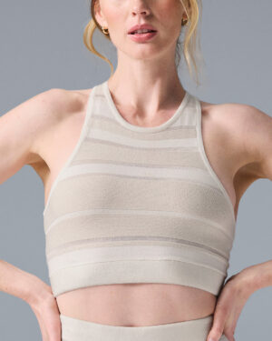 Knitted from a soft, stretchy fabric with faintly shimmery fibers, the Sport Play combines the best elements of a bra and a crop top. It has a chic high neck, a snug underbust band, and a rib-grazing crop that complements the matching shorts. Some of the stripes are see-through??but they??re strategically placed for full coverage. So cute for summer, right?