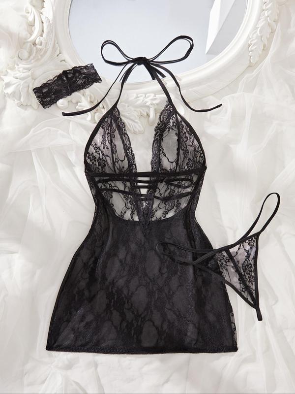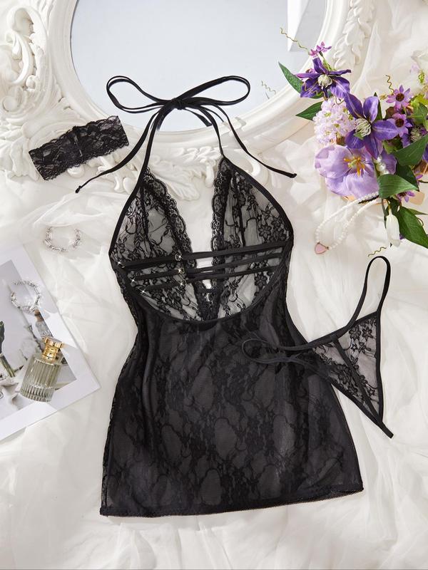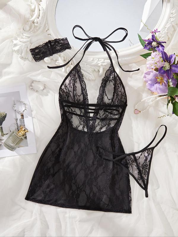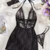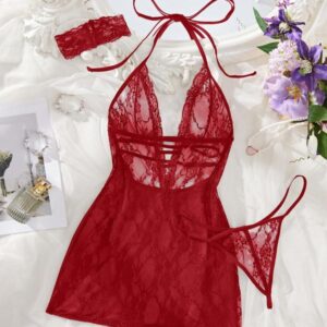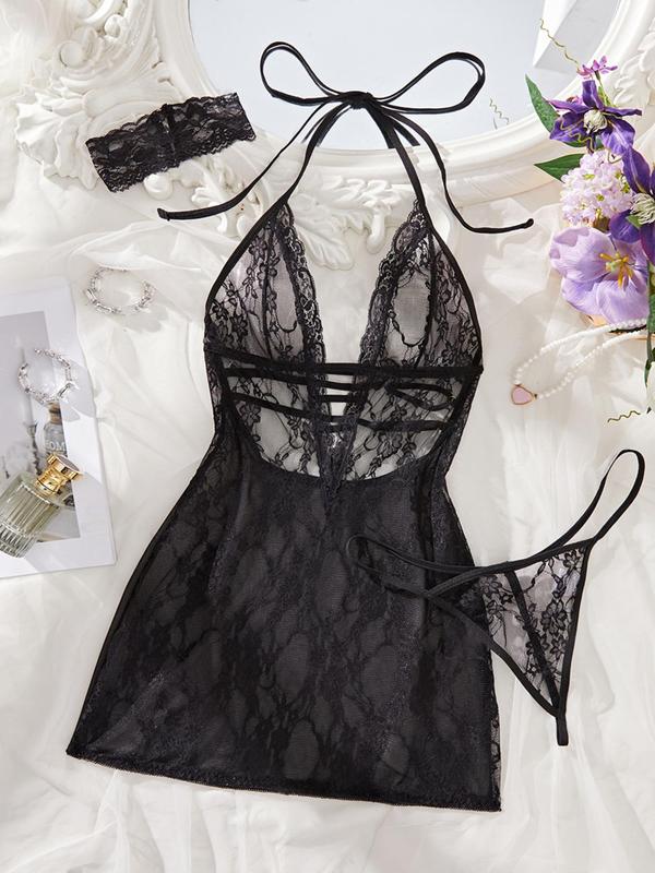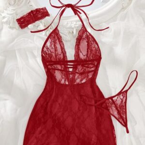 Women’s Floral Lace Cut Out Halter Nightdress & Thong & Neck Decoration Set, Sexy Sheer Sleeveless Nightgown & Panty & Neck Decoration Set, Women’s Sleepwear for All Seasons