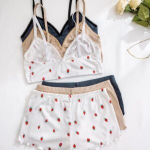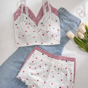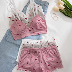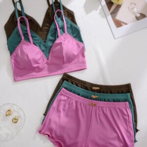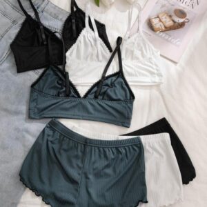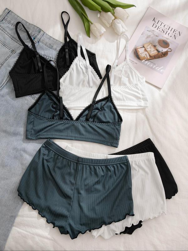 Women’s Wireless Bra & Lettuce Trim Shorts Underwear Set, Summer Outfits 2024, Adjustable Strap Bra & Elastic Waist Shorts, Soft Comfy Breathable Underwear Set for Women