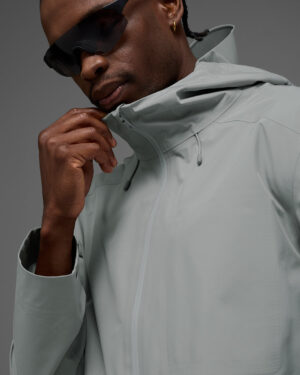 The Alpha Shell Jacket is crafted with a water-resistant shell, fully bonded seams, and waterproof zippers. The streamlined silhouette features a bonded hood visor for enhanced protection, while the hood drawcords let you cinch in warmth.