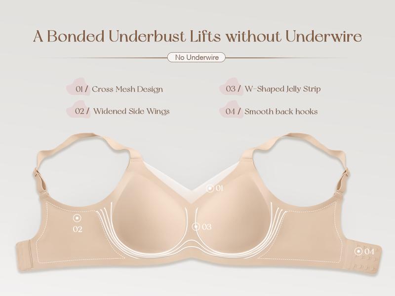 Wireless Bras with Support and Lift – Our wirefree bras feature a W-shaped Jelly Strip and Supportive molded cups around your breasts, giving a nice shape and adequate support for daily life.This comfort bra without underwire means no annoying wire stabbing you in the side, ensuring a buttery soft feeling all day long.