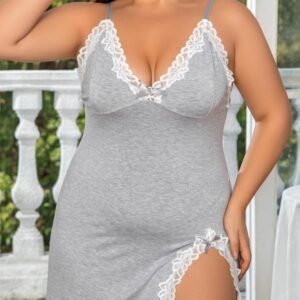 Plus Size Bow Decor Contrast Floral Lace Split Hem Cami Nightdress, Elegant Casual V Neck Sleeveless Nightgown for Summer, Women’s Sleepwear for Home Wear
