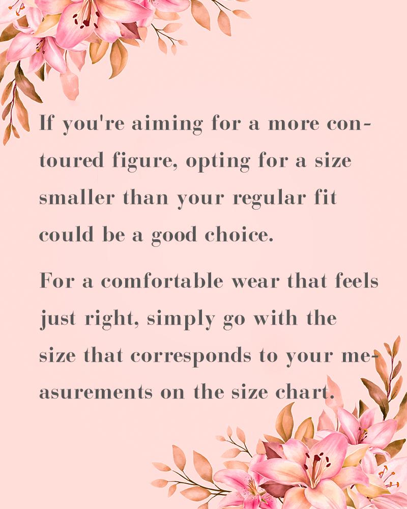 If you’re aiming for a more contoured figure, opting for a size smaller than your regular fit could be a good choice.For a comfortable wear that feels just right, simply go with the size that corresponds to your measurements on the size chart.