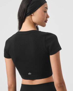 Hello, curves. The Seamless Ribbed Serene Short Sleeve keeps things cool with forward, matching curves at the neckline and hem. Made from a thick, ribbed, cotton-y fabric, this cute crop offers light, everyday support without lining or cups. Pair it up with leggings or chill sweat shorts and slides and head out.
