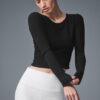 You??ll reach for this top for everything from casual outings to gentle cat-cows. It??s so soft it??s almost silky, slightly sheer and subtly ribbed for extra style points. Fitwise, it hugs the body with a flattering crewneck, a cropped hem and cute, ruched sides. Pick a hue and pair it with leggings and lounge pants galore.