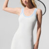 Score the country-club-chic look in this dress. It has striped trim, a simple scoop neck, and a body-skimming fit that nips in at the waist before easing into an A-line skirt with a mid-thigh-length hem. The fabric is lightweight, softly textured, and has a touch of stretch. Serve looks on the streets (with the matching over your shoulders) or on the court (with the or underneath).
